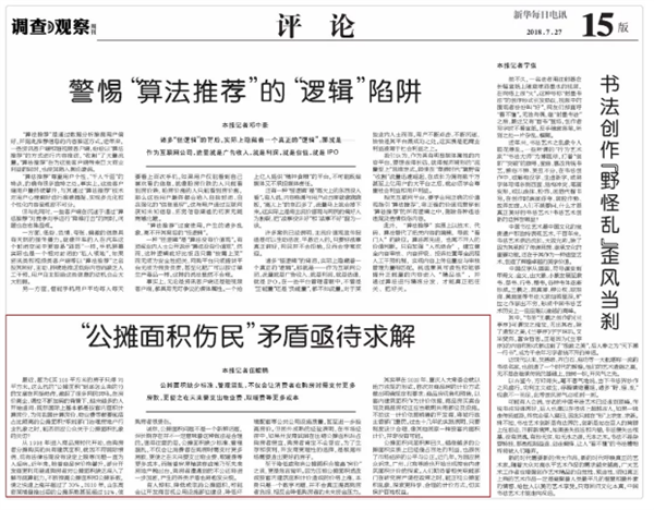 27日,新华每日电讯发表评论《“公摊面积伤民”矛盾亟待求解》,文中追问:既然国际上基本都是按套内面积计算房价,为何我国计算房价、物业费等都要包括占比颇高的公摊面积?职能部门治理房地产行业乱象之时,能否回应公众关于公摊面积乱象的关切?